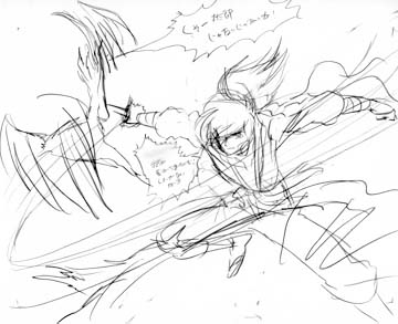 下の絵に描いてあるふきだしのセリフは、実際のアニメーションで使用されたものとは違い、単なるいたずら書きとなっている。次のページはこのラフを元に起こされた原画。